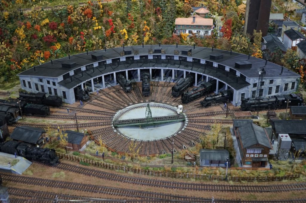 さらにジオラマの中を駆け抜ける鉄道模型に目を向ければ、そこには立派な機関庫までもが忠実に再現されています。今では各地の鉄道博物館でしかお目にかかれない貴重な光景ですが、お子様たちにとっては「きかんしゃトーマス」の世界でお馴染みの光景ではないでしょうか。