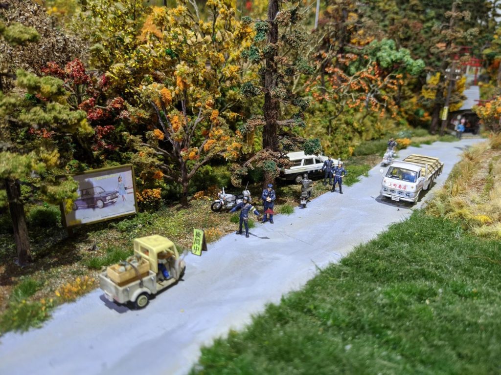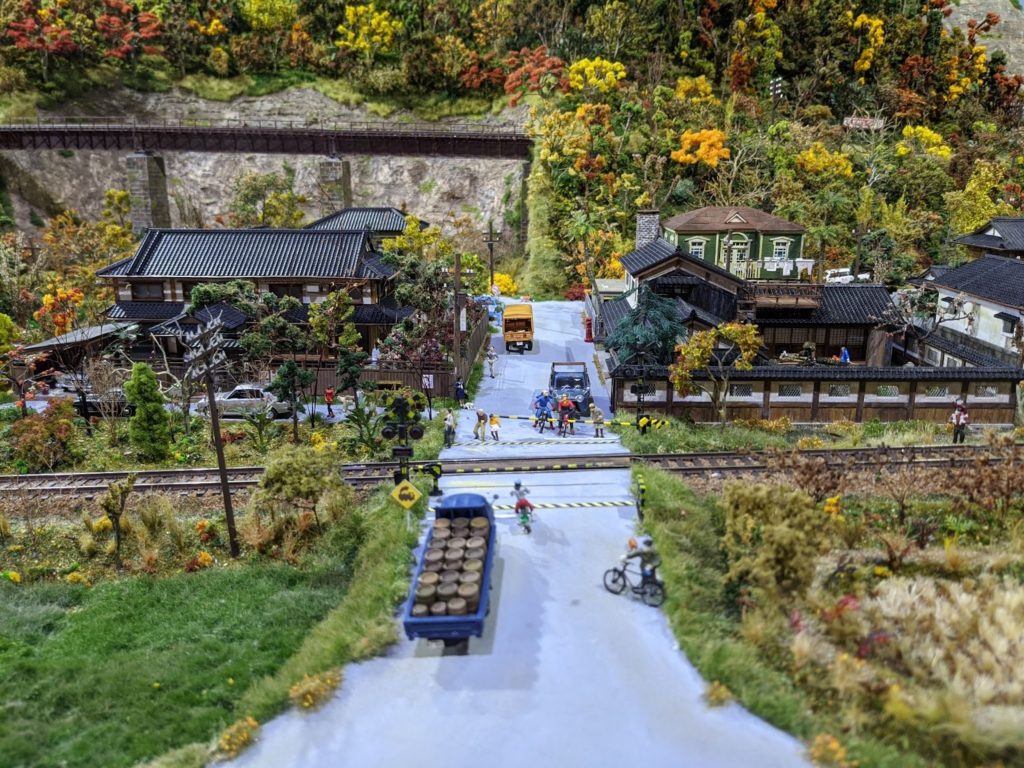 こちらでは、踏切が開くのを今か今かと待つ通行人や自動車の姿が見られます。遮断機のバー一本から、傍らに立つ道路標識に至るまで、細部まで徹底して作り込まれたその光景は、まるで時が止まった本物の街角を覗き込んでいるかのようです。