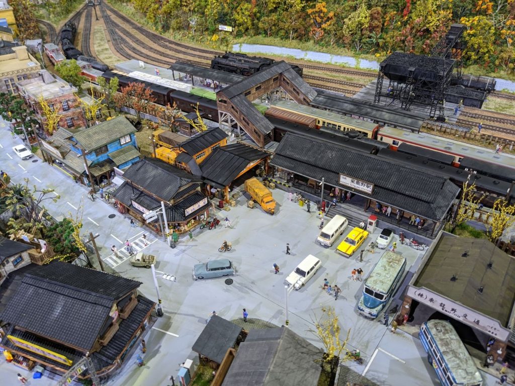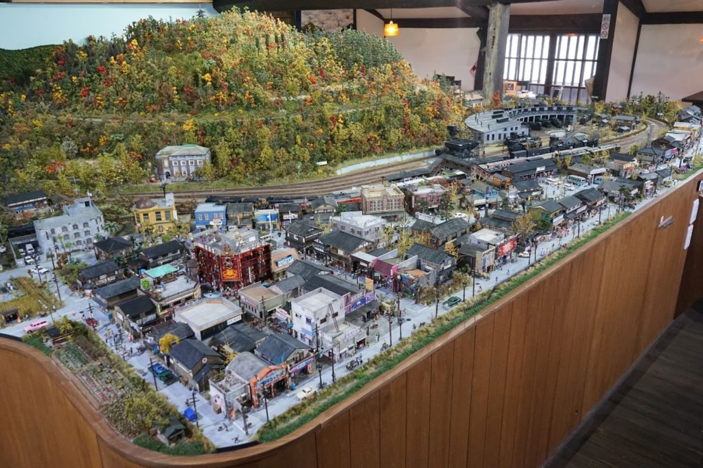 手前には活気あふれる商店街が軒を連ね、そして奥には美しい緑の木々が広がっており、ジオラマの周囲にぐるりと線路が敷かれ鉄道が駆け抜けています。どこを切り取っても溜息が出るほど緻密な仕上がりに、思わずどこから眺めるべきか立ち尽くしてしまうことでしょう。