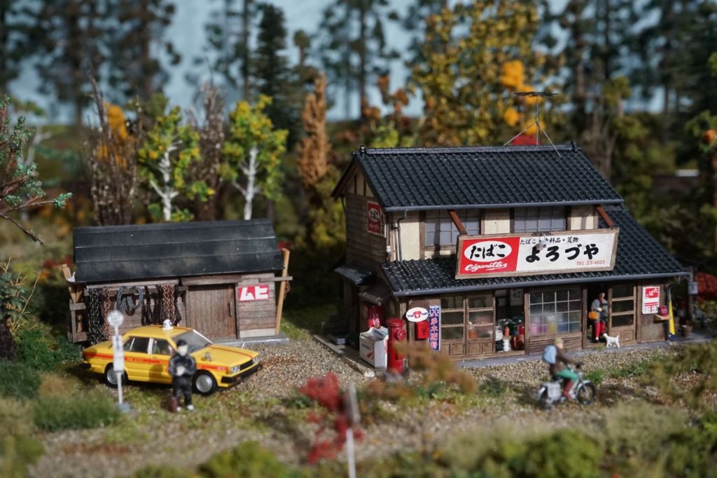 また、賑やかな商店街の先には、町外れののどかな田園風景が見事に描き出されています。雑貨屋の古びた看板や、店先の郵便ポスト、そして静かに佇むバス停。その一つひとつが、かつてそこにあった確かな暮らしを物語り、ジオラマからは人々の息遣いまでもが聞こえてきそうな、温かな情緒が漂っています。